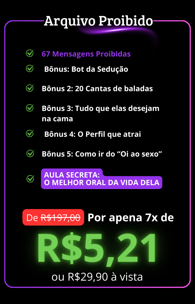Com as 67 Mensagens Proibidas prontas para cada situação, você sempre vai prender a atenção dela e fazê-la responder rápido, curiosa e com vontade de continuar a conversa.